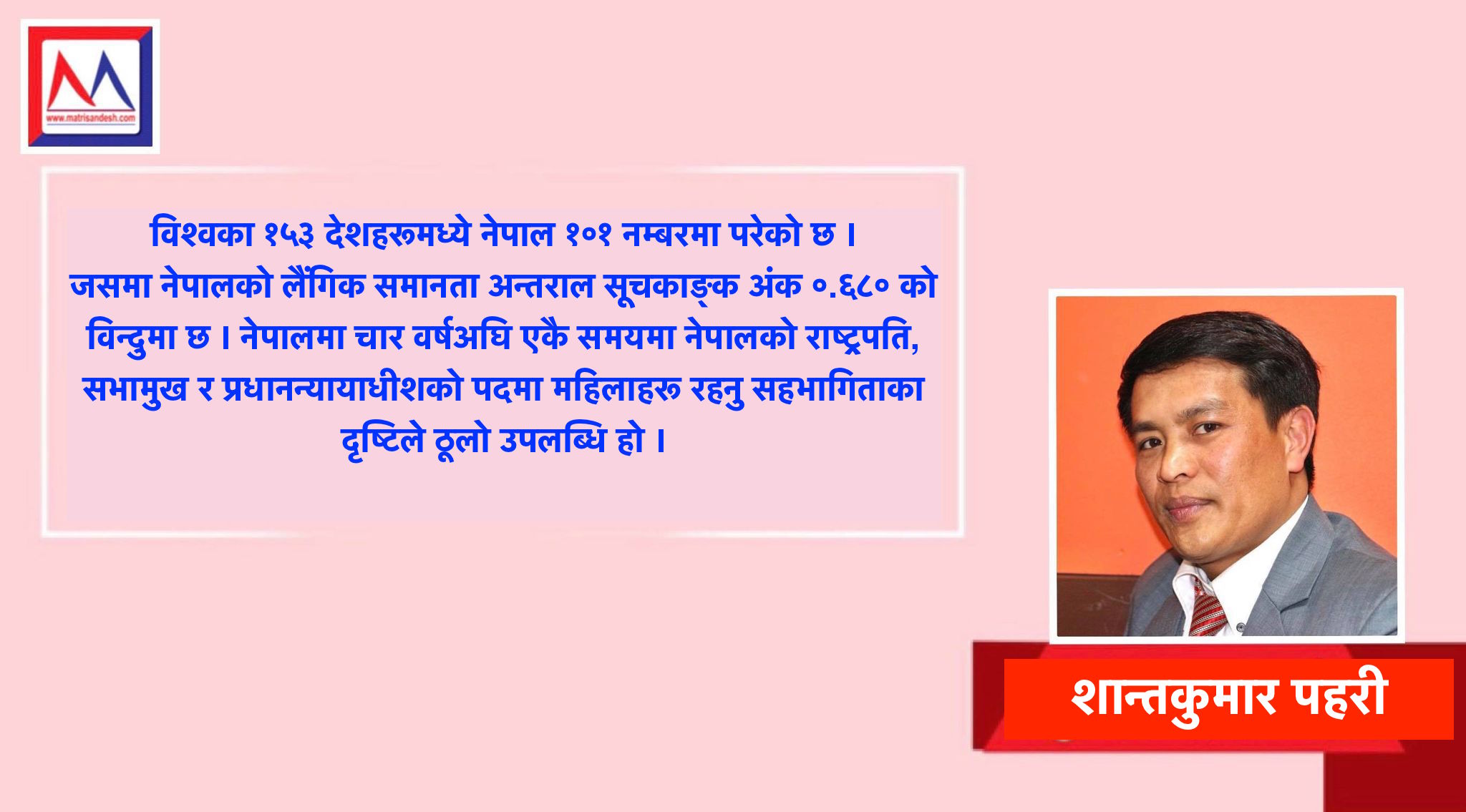 अन्त्यमा महिला पुरुष एक रथका दुई पांग्रा हुन । विश्व जगत सृष्टि गर्ने महिला र पुरुषको समान र हक अधिकार सुनिश्चित गर्न सबै क्षेत्रबाट सकारात्मक हुन जरुरी छ । नेपालमा सर्वउत्कृष्ट स्थानमा महिला भएपनि ग्रामीण क्षेत्रका महिलामा अभिमुखिकरण कम छ । अहिले पनि एसिड पिडित र बलात्कात हुनु सोझासिधा नारीको आवाज बुलन्द गरिदिने कोहि भेटिन्नन !