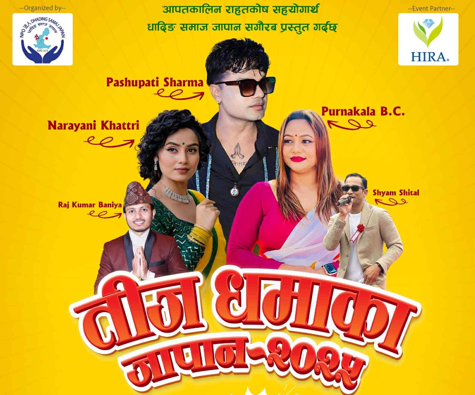 टोकियो । धादिङ समाज जापानले आपतकालिन् राहतकोष सहयोगार्थ आयोजना गर्न लागेको तीज धमाका २०२५ कार्यक्रमको तयारी अन्तिम चरणमा पुगेको छ। अगस्ट २३ तारिख साँझ ५ बजेपछि टोकियोको नाकानो जेरो हलमा हुने कार्यक्रममा लोकप्रिय कलाकारहरू पशुपति शर्मा, पूर्णकला बिसी, राजकुमार बानियाँ, श्याम सितल र नारायणी खत्रीले प्रस्तुतिहरू दिनेछन्।